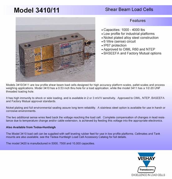 描述:3410是為高精度平臺(tái)秤、手推秤、過程稱重設(shè)計(jì)的低截面剪切梁傳感器?拐饎(dòng)或偏載能力強(qiáng),靈敏度2mv/v或3mv/v。通過OIML和NTEP認(rèn)證。在危險(xiǎn)環(huán)境下使用,可以選擇EEX ia IIC T6認(rèn)證的產(chǎn)品。