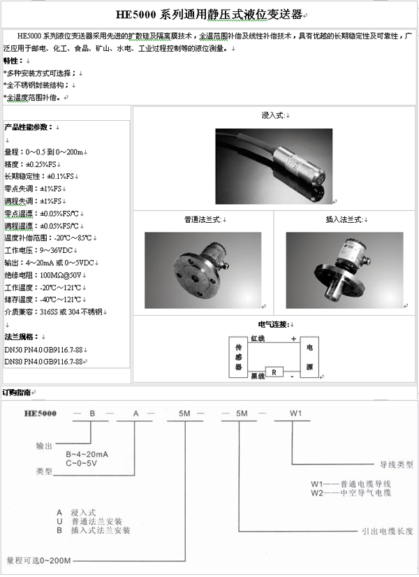 | 產(chǎn)品名稱:HE5000系列 液位變送器(pressure sensor) |